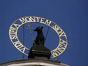 | Алтарная апсида и башни базилики | Базилика Вознесения Девы Марии посреди Страговского монастыря | Статуя агнца на главном фасаде базилики | Главный фасад базилики |