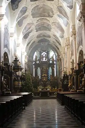 В колоннах главного нефа, отделяющих его от боковых нефов, располагаются 10 боковых алтарей, посвящённых Рождеству Господнему, Божественному Сердцу Господнему, Святому Яну Непомуцкому, Святой Марии Магдалине, Обращению Апостола Павла, Святому Мартину, Святой Анне, Святому Августину, Чешским Покровителям и Посещению Девы Марии[4].