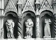 Фасад второй половины XIII века покрыт множеством белых и красных блоков, которые создают геометрические узоры, чем достигается двойной оптический эффект. В храме три входа, большой и два малых. Средний вход является самым большим и величественным, украшенный множеством концентрических дуг с каждой стороны и имеющий два яруса ниш со скульптурами в готическом стиле. Дверь в стиле барокко относится к 1688 году. Над тремя входами находятся три круглых резных окна. Центральное окно является самым большим по размеру и сложности, все три окна из мастерской художника швабской цистерцианской школы XIII века.