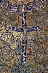 - Мотив характерен для мозаик римских базилик, например, в Санти-Косма-э-Дамиано, Санта-Чечилия-ин-Трастевере, Санта-Пуденциана, Санта-Прасседе и многих других.