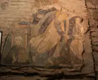 Между тем, в симметрично расположенном конце (справа от алтаря, с точки зрения мирян) найдена хорошо сохранившаяся фреска IX века «Сошествие Христа во ад», в углу которой имеется поясное изображение епископа, держащего в левой руке Евангелие, а правой — благословляющей народ. Так что вполне допустимо, что Кирилл был погребён под этой фреской. Сама фреска представляет собою первое сохранившееся в итальянском искусстве изображение на данную тему[3]. Христос в развевающейся хламиде нисходит в ад, попирая ногами Сатану, и выводит оттуда Адама.