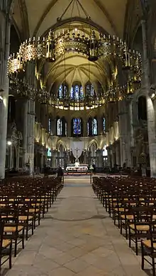 Церковь имеет в плане латинский крест. Неф и рукава трансепта — романские, это наиболее древние части храма. Хор и галерея с часовнями выполнены в готическом стиле. Самая новая часть — фасад южного трансепта.