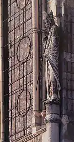 Базилика имеет незначительное количество скульптурных украшений. На главном фасаде на восстановленных античных колоннах размещены две статуи. Одна из них, конечно же, статуя Святого Ремигия. Вторая статуя — Святого Петра — свидетельствует о принадлежности храма к Римско-католической церкви.