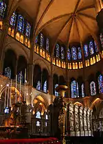 Реконструкция хоров, при которой в их высоких окнах были установлены витражи, также была инспирирована символикой света. По главной оси храма на самом верхнем уровне центральное место занимает изображение Девы Марии, справа и слева от которой представлены изображения апостолов и пророков. Ниже Девы Марии по главной оси в центре изображён Святой Ремигий, окруженный изображениями его преемников, архиепископов Реймса, сначала канонизированных, а затем и неканонизированных, вплоть до Генриха I Французского, который скончался в 1175 году, незадолго до выполнения витражных окон.