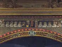 Внутренняя поверхность арки покрыта растительными мотивами, а в центре её находится монограмма строителя базилики папы Пасхалия I.