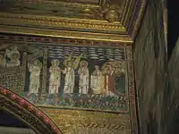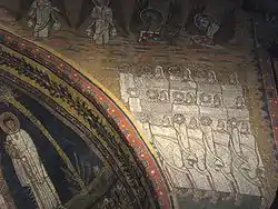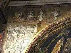 Врата небесного Иерусалима охраняют ангелы (Отк. 21:12), и к этим вратам движутся толпы спасённых, удостоенных войти в город. Группу в левой части мозаики ведёт ангел; в правой — ангел с апостолами Петром и Павлом. Правая группа спасённых серьёзно повреждена в XVI и XIX веках, зато в левой наблюдаются епископы, облачённые в ризы и паллий, должностные лица в разноцветных хламидах и богато одетые женщины. Все они держат в руках золотые венцы. Обычно эти две группы связывают с последними стихами 21 главы Откровения: «Спасенные народы будут ходить во свете его, и цари земные принесут в него славу и честь свою. Ворота его не будут запираться днем; а ночи там не будет. И принесут в него славу и честь народов. И не войдет в него ничто нечистое и никто преданный мерзости и лжи, а только те, которые написаны у Агнца в книге жизни» (Отк. 21:24-27).