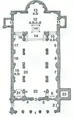 (1) (здесь и далее номера соответствуют номерам на плане) Фасад базилики выполнен в конце XVI — начале XVII веков по образу римской церкви Святых Апостолов. Крест, венчающий тимпан, выполнен в X веке в византийском стиле и является одним из немногих свидетельств о храме, существовавшем до перестройки Гонория III.