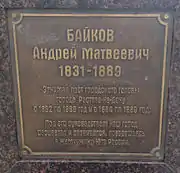 - СПИСОК бывшим воспитанникам ИМПЕРАТОРСКОГО Училища Правоведения, окончивших в оном курс наук в 1840–1917 гг. ... 11-го выпуска, 1850 г. 13 Мая.. genrogge.ru. — «1. Байков 1, Андрей Матвеевич, IX-м классом; действительный статский советник; Ростовский городской голова. † 1889 г.».