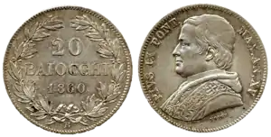 В 1866 году Папская область, как и остальная Италия, присоединилась к Латинскому валютному союзу. Основной денежной единицей вместо скудо стала папская лира, разменной монетой вместо байокко стал чентезимо.