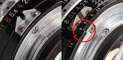 - Установка таких объективов на современные фотоаппараты может повредить камеру из-за несовпадения заднего торца кольца диафрагмы с ответной частью байонета камеры, вокруг которого расположено подпружиненное кольцо с «лапкой». Их использование возможно только после переделки, описанной ниже в разделе AI’d[8]. Некоторые профессиональные фотоаппараты, рассчитанные на объективы AI и более поздние, предусматривали откидную «лапку» поводка, позволяющую устанавливать старую оптику, однако в этом случае сопряжение с экспонометром камеры невозможно.