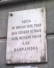 Мемориальная доска на стене дома в Баку, где 30 апреля 1920 года был создан первый клуб женщин имени Али Байрамова