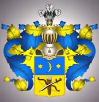 Щит увенчан обыкновенным дворянским шлемом с дворянскою на нём короною и тремя страусовыми перьями. Намёт на щите голубой, подложенный золотом.