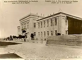 - Старая открытка начала XX века с надписью «Первое женское мусульманскаое училище на Кавказе»