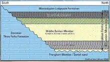 - Нижняя сланцевая часть (Lower shale member, Lower Bakken) состоящая из сланцев, богатых органическим веществом, мощностью до 15 метров.