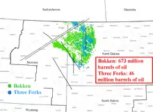 | Балансовые запасы нефти | технически извлекаемые — 7,4 млрд баррелей (Баккен + Три Форкс, на территории США, оценка USGS 2013 года)[1][2] |