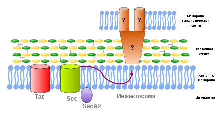 Инжектосомы грамположительных бактерий функционально аналогичны системам секреции III и IV типов у грамотрицательных бактерий. Например, Streptococcus pyogenes впрыскивает по меньшей мере один фактор вирулентности, NAD+-гликогидролазу, в цитоплазму кератиноцитов именно по механизму работы этих систем. В эукариотической клетке NAD-гликогидролаза разрушает гликозидную связь в NAD+, в результате чего образуются никотинамид и АДФ-рибоза — важный вторичный посредник, который может нарушить сигнальные пути клетки. Формирование поры в мембране эукариотической клетки осуществляет белок SLO, который предварительно секретируется системой Sec[1].
