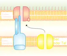 Системы SRP доставляют белки-мишени в клеточную мембрану. Трансмембранные белки, которые и являются мишенями системы SRP, имеют гидрофобные участки и поэтому нестабильны в цитоплазме. Поэтому в пути SRP секреция белка происходит котрансляционно: синтезированный участок полипептидной цепи проталкивается в канал SecYEG, в то время как рибосома транслирует оставшуюся часть белка. Для этого механизма необходимы частицы распознавания сигнала (англ. signal recognition particle, SRP). SRP связываются с трансмембранным участком белка, как только он выходит из рибосомы. Далее SRP взаимодействует с белком FtsY, который доставляет комплекс мРНК, рибосомы и частично синтезированного полипептида к каналу SecYEG. Далее постепенная секреция белка и трансляция его оставшейся части идут одновременно, и, наконец, белок заякоривается в клеточной мембране своим трансмембранным доменом[1].