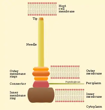 Структурно в системе III типа можно выделить базальный комплекс, игольчатый компонент и транслокон. Базальный комплекс проходит через клеточную мембрану, периплазматическое пространство и внешнюю мембрану, формируя розетковидную структуру. Чаще всего базальный комплекс образуют по меньшей мере 15 белков. Из розетки выходит палочковидный филамент, называемый иглой. Игла обращена во внеклеточное пространство, полая внутри и имеет достаточный диаметр, чтобы через неё мог пройти неуложенный белок. На конце иглы находится специальный комплекс, который определяет близость эукариотической клетки и регулирует секрецию эффекторных белков. Этот же комплекс отвечает за вставку транслокона в мембрану эукариотической клетки. Транслокон содержит пору, через которую бактериальный белок проникает в эукариотическую клетку[1].