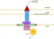 Системы III типа используются многими патогенами, например, Yersinia, Salmonella и Shigella[1]. Посредством систем секреции этого типа выделяются компоненты жгутика. Родство флагеллина и белков системы III типа указывает на общность их происхождения[3][4].