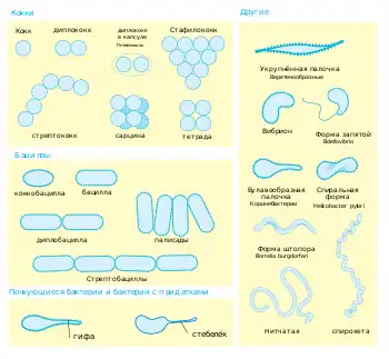Большинство бактерий имеют шарообразную (кокки) или палочковидную (бациллы) форму[32]. Некоторые бактерии, называемые вибрионами, выглядят как слегка закрученные палочки или запятые; спириллы имеют спиральную форму, а спирохеты имеют длинные плотно закрученные клетки. Описаны и бактерии с другими необычными формами клеток, например, клетками в форме звезды[33]. Разнообразие форм бактериальных клеток обусловлено особенностями их клеточных стенок и цитоскелета. Форма бактериальной клетки обусловливает их способность поглощать питательные вещества, прикрепляться к поверхностям, плавать в жидкостях и ускользать от питающихся бактериями организмов[34].