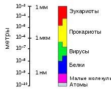 Бактериальные клетки имеют чрезвычайно разнообразную морфологию (то есть форму и размер). Как правило, бактериальные клетки в десять раз мельче эукариотических и достигают 0,5—5 мкм в длину. При этом есть и бактерии, видимые невооружённым глазом: так, Thiomargarita namibiensis достигает половины миллиметра в длину[27], а длина Epulopiscium fishelsoni может составлять 0,7 мм[28]. Один из видов бактерий вырастает до 2 см в длину, отличается необычно сложной клеткой, фактически стирая границу между прокариотами и эукариотами и, по одному из предположений, даже является недостающим звеном в эволюции живого от одноклеточных организмов[29]. К числу самых мелких бактерий можно отнести представителей рода Mycoplasma, длина клеток которых не превышает 0,3 мкм, что сравнимо по размерам с вирионами некоторых вирусов[30] и лишь немного превышает предел разрешающей способности оптического микроскопа. Существуют ещё более мелкие бактерии (ультрамикробактерии), однако они плохо изучены[31].