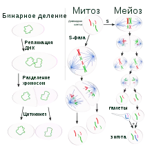 В отличие от многоклеточных организмов, у одноклеточных организмов, в том числе бактерий, увеличение клетки в размерах и размножение путём деления клеток тесно связаны[93]. Бактериальные клетки достигают определённого размера и после этого делятся бинарным делением. В оптимальных условиях бактерии растут и делятся очень быстро, описан пример морской псевдомонады, популяция которой может удваиваться каждые 9,8 минуты[94]. При бинарном делении образуются две дочерние клетки, идентичные материнской. Некоторые бактерии, хотя и размножаются простым делением, образуют более сложные структуры, предназначенные для распространения дочерних клеток. Примером могут служить плодовые тела миксобактерий и воздушные гифы стрептомицетов. Некоторые бактерии способны к почкованию, когда дочерняя клетка образует вырост на материнской, который впоследствии отделяется и переходит к самостоятельной жизни[95].