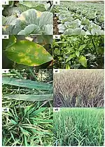 — сосудистый бактериоз крестоцветных (возбудитель Xanthomonas campestris): поражает капусту и другие крестоцветные; листья желтеют, засыхают, сморщиваются; проводящие сосуды чернеют; появляется пятнистость стеблей и стручков, гниль корнеплодов[5][6].