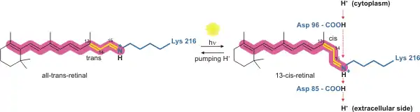 Протонная проводимость осуществляется при содействии прикреплённой внутри пучка спиралей молекулы кофактора — ретиналя. Он перекрывает центральный канал бактериородопсина. Поглотив фотон, ретиналь переходит из полностью-транс- в 13-цис-форму. При этом он изгибается и переносит протон с одного конца семиспирального пучка на другой. А потом ретиналь разгибается и возвращается назад, но уже без протона.