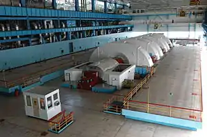 Машинное отделение, примыкающее к реакторному, представляет собой в плане прямоугольник со сторонами 156 и 51 м, его высота составляет 42 м. Компоновка машинного зала предусматривает продольное расположение турбины, также в нём находится деаэраторная этажерка и примыкающая сбоку этажерка электротехнических устройств. Оборудование второго контура в машзале расположено открыто, так как он не радиоактивен. Машинный зал имеет железнодорожный и автомобильные въезды, технологические связи с общестанционными объектами осуществлены открытыми эстакадами трубопроводов. Также к главным корпусам примыкают площадки открытой установки трансформаторов.