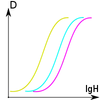 Характеристические кривые слоёв цветного фотоматериала, разбалансированного по светочувствительности. H — экспозиция, D — оптическая плотность. Сдвиг кривой вправо соответствует меньшей светочувствительности