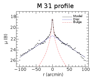 Зависимость поверхностной яркости от расстояния до центра для различных компонент галактики описывают законом Серсика[8]: