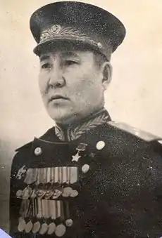 После окончания Великой Отечественной войны 109-я гвардейская стрелковая дивизия и её командир отправляются в Монголию, где вошли в 53-ю армию Забайкальского фронта. В Маньчжурской стратегической операции советско-японской войны в августе 1945 года дивизии вновь показала хорошие боевые качества в Хингано-Мукденской фронтовой операции. Громя войска японской Квантунской армии, дивизия совершила беспримерный форсированный марш через безводные степи провинции Чахар и высокогорные хребты Большого Хингана, форсировала несколько рек, в полном порядке и в срок вышла в заданный район и своими действиями способствовала успеху всей армии.[2]