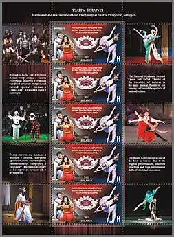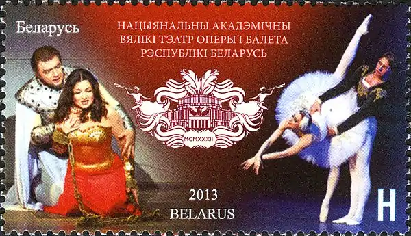 В 2013 году в серии «Театры Белоруссии» выходили почтовая миниатюра и, соответственно, малый лист, чествовавшие творческие достижения коллектива НАБТБ РБ (художественное оформление Анны Малаш). На марке справа представлена сцена из балета «Лебединое озеро», в которой были задействованы народные артисты Республики Беларусь Ольга Гайко и Игорь Артамонов[≡]. На купонах малого листа можно видеть сцены из других спектаклей, составляющих балетный репертуар театра[≡]: