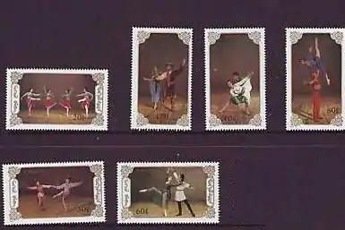 На второй марке (Sc #2050) изображена Майя Плисецкая, исполняющая хореографическую миниатюру «Умирающий лебедь»[15], поставленную в 1907 году М. Фокиным. На третьей марке (Sc #2051) запечатлён дуэт графа Альберта (Ирек Мухамедов) и Жизели (Людмила Семеняка) из балета Адольфа Шарля Адана «Жизель». На заключительной марке серии (Sc #2052) изображён Владимир Васильев в балете «Спартак»[15]. На блоках (Sc #2053, 2054) представлены сцены из балетов «Жар-птица» И. Стравинского и «Лебединое озеро» (Одетта и Одиллия — Наталья Бессмертнова, Принц — Михаил Лавровский)[35].