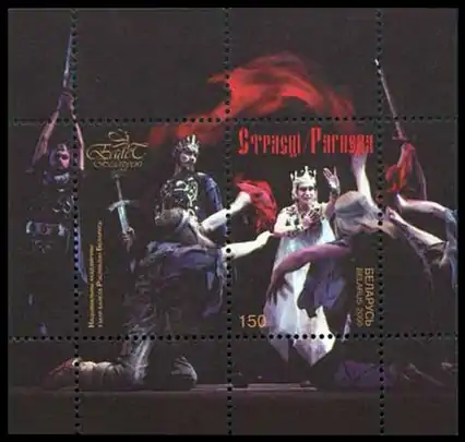 На блоке изображена сцена из балета «Страсти» («Рогнеда») Андрея Мдивани, выполненная по фотографии, на которой запечатлены актёры НАБТБ РБ. Впервые балет был поставлен в 1995 году в НАБТБ РБ в Минске Валентином Елизарьевым. В роли Рогнеды — Ирина Еромкина[21][≡]: