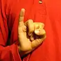L, указательный и большой пальцы разогнуты и разведены, остальные пальцы собраны в кулак.