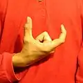 O, четыре пальца сложены вместе и слегка согнуты, образуя дугу, а кончик большого пальца касается кончиков указательного и среднего пальцев, образуя круг.