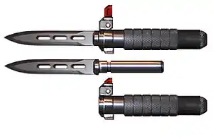 В США баллистические ножи появились в начале 1980-х гг.[1]. Эти ножи проектировались как бесшумное оружие. Их можно использовать как обычные, не вынимая клинок из рукоятки или как метательные. Для метания ножа надо потянуть за рычажок и нажать на кнопку (возможны и иные варианты в зависимости от конструкции конкретного ножа). Пружина внутри него способна метнуть клинок на 6 метров при скорости в 60 км/ч (~16 м/с)[1][2].