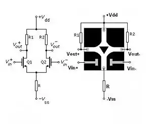 Этот прототип подобен интегральным дифференциальным парам транзисторов, что определяет возможные области его применения (дифференциальные входные каскады операционных усилителей, компараторов, логические схемы, подобные ЭСЛ, эмиттерно-связанные триггеры Шмитта и др.).