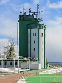 - Маяк (1813—1816). Первый деревянный маяк был построен в Пиллау в 1741 году, однако со временем стало ясно, что он плохо справляется со своими обязанностями, и было принято решение о строительстве нового большого каменного маяка. Сегодня балтийский маяк — самый западный в России. Был построен в начале XIX века. Автор маяка доподлинно неизвестен, по одной версии это известный архитектор Карл Шинкель, по другой — гидроинженер Шульц[40]. Высота маяка — 33,2 метра над уровнем моря. Огонь виден на расстоянии 16 морских миль. Изначально световой луч создавался за счёт горения растительного масла, которое в 1874 году было заменено на керосин. Затем использовались газовые лампы, а с 1913 года маяк перешёл на электрическое освещение. Во время войны маяк пострадал несильно, работы по его восстановлению закончились уже в сентябре 1945 года. Поскольку порт Пиллау (переименован в Балтийск 27 ноября 1946 года) стал местом базирования кораблей Балтийского флота, маяк пришлось срочно восстанавливать. Вначале здесь был зажжён временный огонь, а в 1953 году, после завершения строительства нового технического здания, маяк был полностью восстановлен. Источником огня в фонарном сооружении служил светооптический аппарат немецкой фирмы «Тейт Майер». Электропитание аппарата осуществлялось от отечественных дизель-агрегатов. Уже в советское время маяку был присвоен первый класс, а период маяка стал равен 12 секундам (три секунды темноты, девять секунд света). В настоящее время маяк светит белым затмевающимся огнём. Вместе с Передним Балтийским маяком, представляющим собой белый ромб и белую трапецию с чёрной вертикальной полосой на ажурной четырехгранной башне, он обозначает створ 302,1°—122,1°, ведущий в морской канал порта Балтийск.[41]