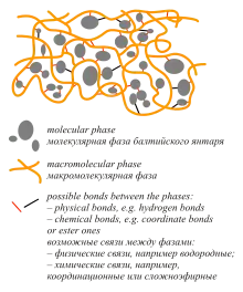 Балтийский янтарь (сукцинит) не является полным полимером, так как не состоит из множества «мономерных звеньев». Макромолекулярная структура — макромолекулярная сетка с поперечными связями, поры которой (свободные пространства) заполнены компонентами молекулярной структуры (например, моно- и сесквитерпенами). Сложная химическая структура балтийского янтаря может быть названа супрамолекулярной[10]. Такая структура делает строение янтаря более компактным, жестким и более устойчивым к внешним факторам. Она также способствует хорошей сохранности растительных и животных инклюзов в янтаре[11].