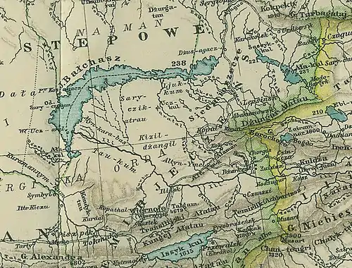 Александр фон Гумбольдт полагал, что озеро Балхаш было известно китайцам под именем «Си-Хай» (Западное море; это название было перенесено в атлас 1855 года). Название «Балхаш-Нор» (Balas-nur — «озеро Балхаш»), данное озеру джунгарами, отражено на карте Юлиуса Клапрота 1833 года, составленной по съёмкам европейских послов. Тюрки и монголы, обозначавшие белым цветом все географические объекты к западу от своих поселений, назвали его «Ак-Денгиз» («белое море»), а когда границы их государств отодвинулись на запад, то озеро стало «синим» (восточным) — «Кукча-Денгиз». Казахи именовали озеро «Тенгиз» (каз. Теңіз), что значит «море»[10].