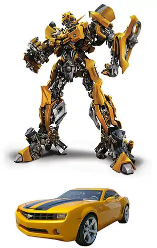 Трансформация — При выборе альт-формы для персонажа (автомобиля) продюсер фильма Дон Мёрфи первоначально настаивал на сохранении модели «Фольксваген Жук», в которую превращался Бамблби в мультфильме. Однако в итоге выбор был сделан в пользу «Chevrolet Camaro», благодаря чему Бамблби получился более внушительным и современным персонажем, способным на равных сражаться с большинством десептиконов (эпизод выбора между двумя машинами был комически обыгран в начале фильма). Вооружение в фильме: плазменная пушка и пулемёт на правой руке, ракетницы на плечах. Скорострельность: пушка — 30 выстрелов в минуту, ракетницы — 2 выстрела в минуту. Дальность поражения: пушка — 550 метров, ракетницы — 1500 метров. Защитное приспособление: маска, прикрывающая оптические сенсоры[36]. Дополнительное вооружение: титановый меч, выдвигающийся из левой руки[37]. Уязвимые места — нижняя часть корпуса и ноги.