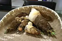 Свежесрезанные бамбуковые побеги имеют очень твёрдую, светло-жёлтую сердцевину с узкими перемычками в коленах воздушных камер. Бамбук, используемый в пищу, срезают сразу после всхода, когда побеги ещё покрыты очень прочными, опушенными тёмно-коричневыми листьями, которые перед кулинарной обработкой удаляют.
