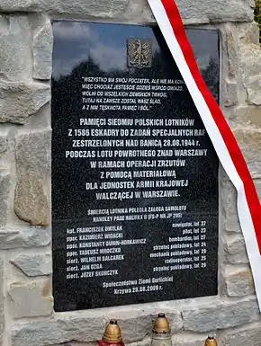28 августа 1944 года был сбит самолёт Handley Page Halifax военно-воздушных сил Великобритании, выполнявший специальное задание по доставке груза из итальянского города Бриндизи в восставшую Варшаву. Экипаж самолёта, состоящий из семи человек, погиб и их останки были похоронены местными жителями на месте крушения самолёта. В 1980 году останки лётчиков были эксгумированы и перезахоронены на Раковицком кладбище в Кракове. На месте крушения был установлен памятный знак, который 12 июня 2009 года был снесён по согласованию с родственниками родных лётчиков. 28 августа 2009 года была установлен новый памятный знак.