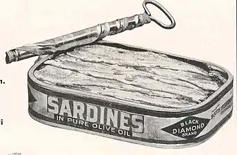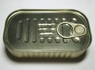 Жестяная консервная банка с ключом, наматывающим на себя крышку банки