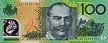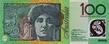 $100 | 158×65 | В центре — портрет Нелли Мелба; слева — изображение убранства театра, в котором играла Мелба во время своей концертной программы 1902 года, изображение актрисы на сцене, подпись Мелбы; справа — виньетка с изображением лирохвоста. | В центре — портрет Джона Монаша, его подпись; слева — изображение нагрудного знака Восходящего Солнца, Джона и осла (изображение на основе памятника в Мельбурне), кавалерия; справа — солдаты и пушка | Лирохвост и 100 | 15 мая 1996 | 2020 |