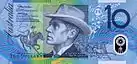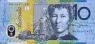 $10 | 137×65 | В центре — портрет Банджо Патерсона, отрывок из поэмы Патерсона «Парень со Снежной реки» (микропечать); слева — лошадь с наездником (проводится параллель с поэмой Патерсона «Парень со Снежной реки»), виньетка с ветряной мельницей; справа — бегущие необъезженные лошади, надпись «Waltzing Matilda» (австралийская народная песня, называемая «неофициальным гимном Австралии» и слова к которой написаны Патерсоном). | В центре — портрет Мэри Гилмор, слева от него — портрет постаревшей Гилмор, написанный Уильямом Добеллом, отрывки из поэмы «Никогда врагу не собирать наш урожай» (микропечать); слева — изображение волов, перевозящих шерсть, а также сельской женщины и сельской местности; справа — подпись Мэри Гилмор. | Ветряная мельница | 1 ноября 1993 | 2017 |