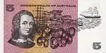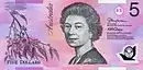 $5 | 130×65 | В центре — портрет Елизаветы II; слева — ветка эвкалипта (вид лат. Eucalyptus haemastoma); справа — виньетка с изображением цветка эвкалипта. | В центре — изображения современного здания австралийского парламента и старого здания; слева — ландшафтный проект нового парламентского здания; справа — геометрические фигуры, отражающие архитектурные черты нового здания парламента. | 24 апреля 1995 | 2016 | |