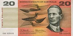 $20 | 160×80 | Австралийский летчик Сэр Чарльз Эдвард Кингсфорд-Смит | Австралийский инженер, изобретатель и пионер авиации Лоуренс Харгрейв | - | 1966 | 1994 |